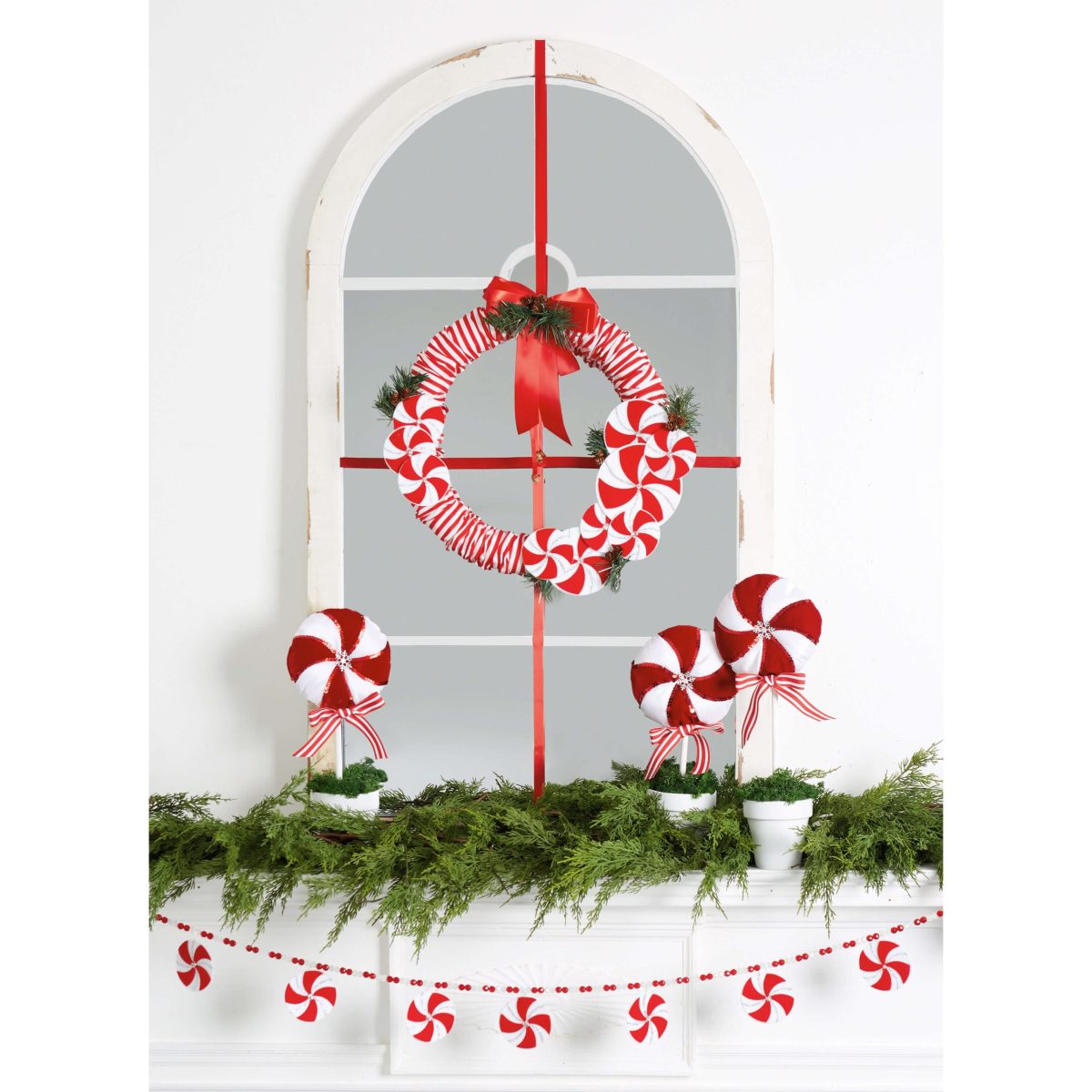 Candy Cane theme tree skirt, stocking, wrapped wreath, garland, and topiaries are fun and easy projects for festive decorating. Peppermints are created with easy applique technique. Tree skirt has ribbon ties and faux fur border band; lined stocking has faux fur cuff. Wreath, garland and topiaries combine simple sewing with crafty accents and glued embellishments. Sew rating:Easy.
