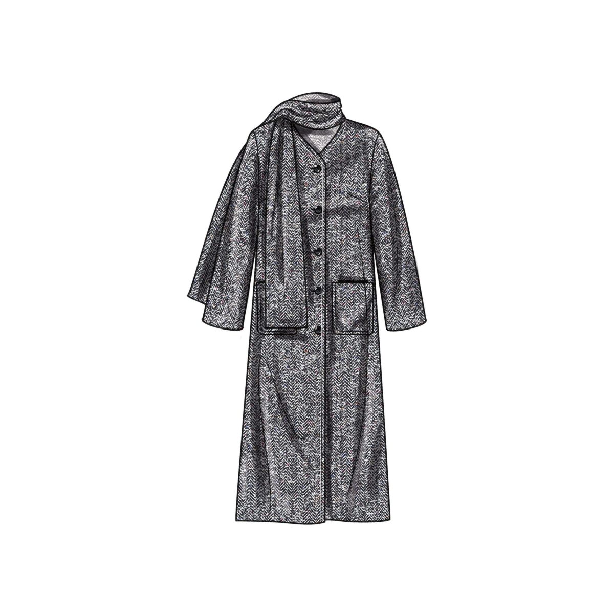 Lined coat and jacket with attached scarf, button front closure and pockets. Coat comes in two lengths. View C : short jacket. Sew rating: Average.