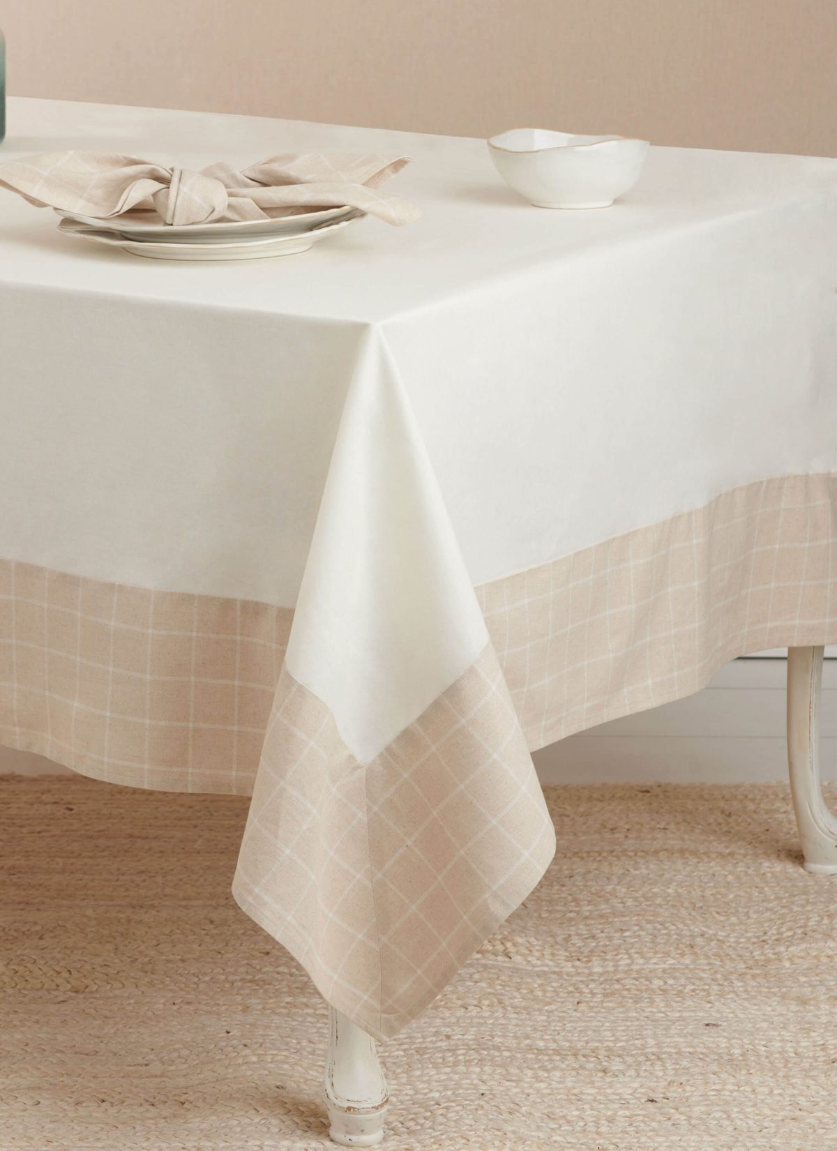 Rectangular table cloth and round table topper with contrast fabric bands. Round table topper has hem ruffle. Ruffled chair pads attach with wide ties and bows. Runner with multiple ruffles has ribbon trim. Quatrefoil runner and place mats have braid trim. Napkins are finished with narrowly-hemmed edges. Sew Rating: Easy.