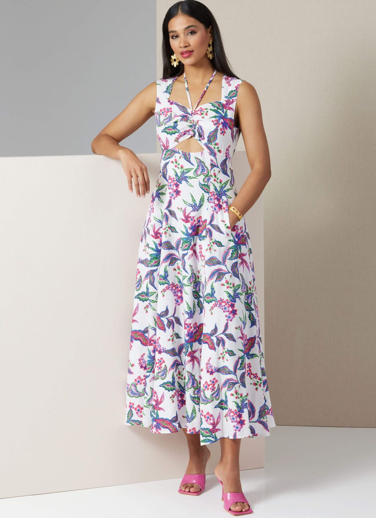 Fit and flared dress, close-fitting through bust and waist, has front cut-out detail, bias ties, front welt pockets, invisible back zipper with hook and eye closure and 5/8″ narrow hems.