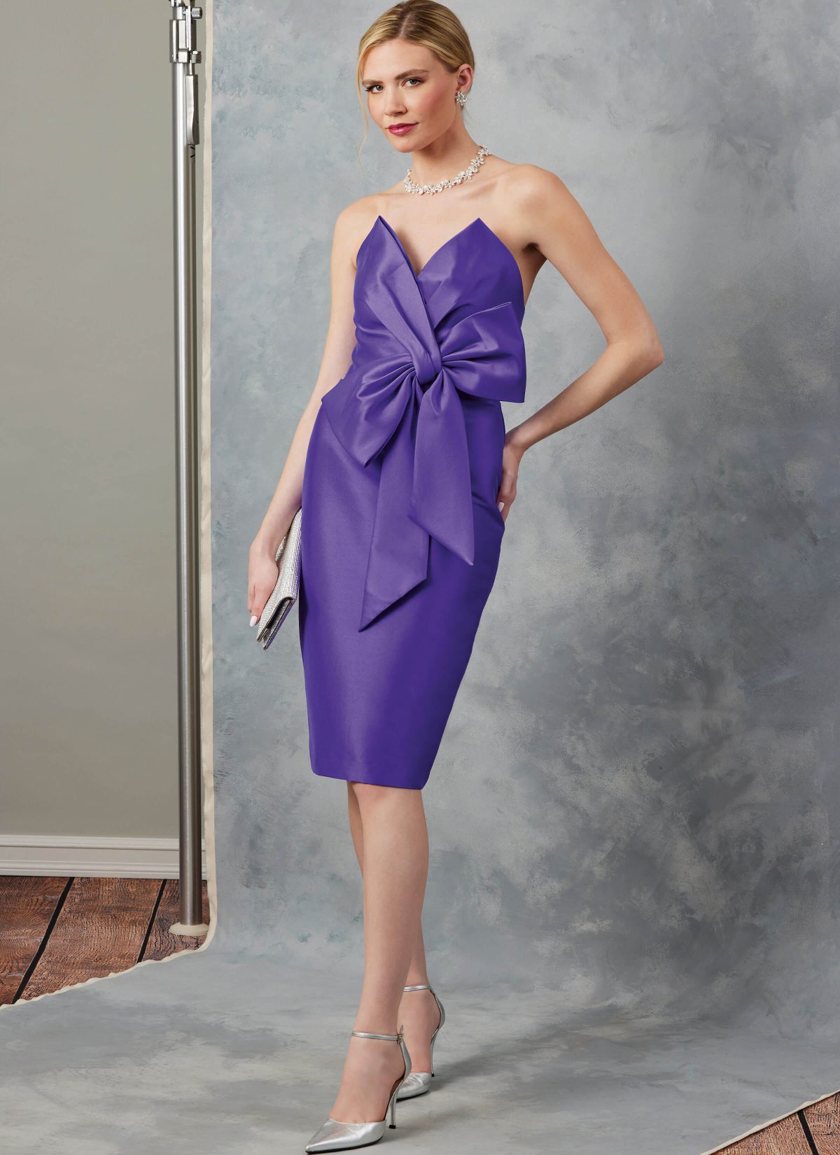Close-fitting, lined strapless dress has draped bodice with bow detail, fully interfaced built-in foundation, hanging straps, invisible back zipper with hook and eye closure and back vent.