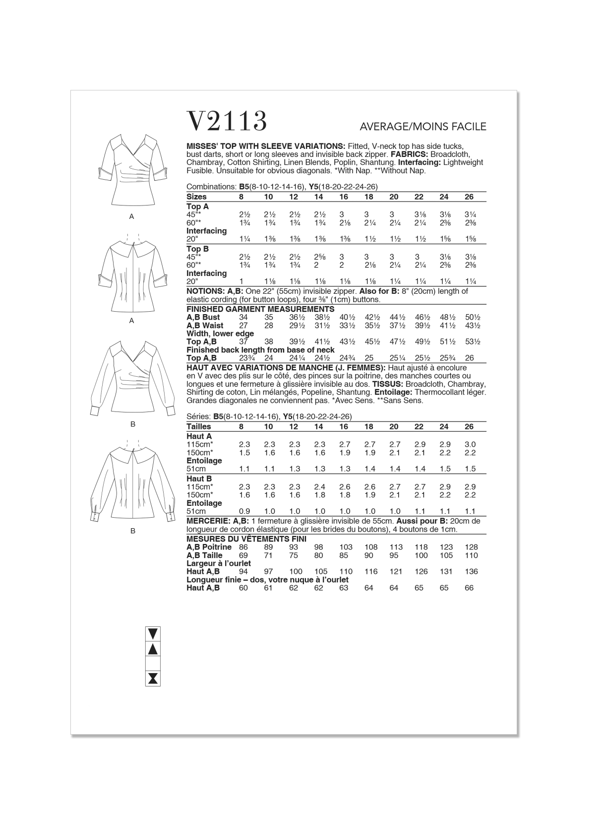 Vogue Patterns Sewing Pattern V2113 Misses’ Top with Sleeve Variations
